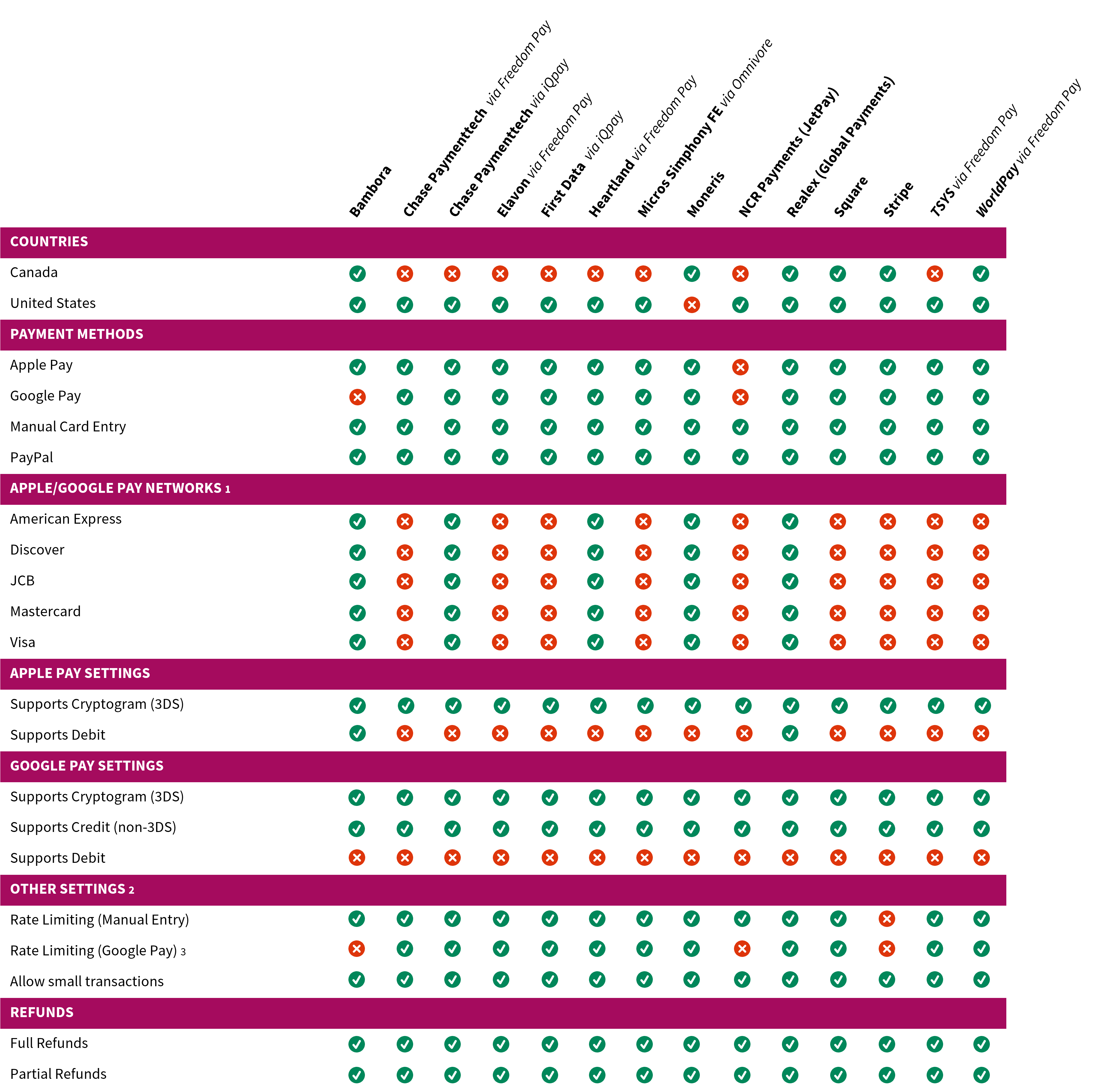 We integrate with many different payment processors here at Ready, either directly or indirectly through partner gateways such as Freedom Pay or iQpay (powered by iQmetrix). All of our supported processors work for both Pay-at-Table and Mobile Ordering payments. Depending on the processor, we support various payment methods and additional configurable functionality. The chart below outlines our current processor ecosystem and supported payment methods and features.